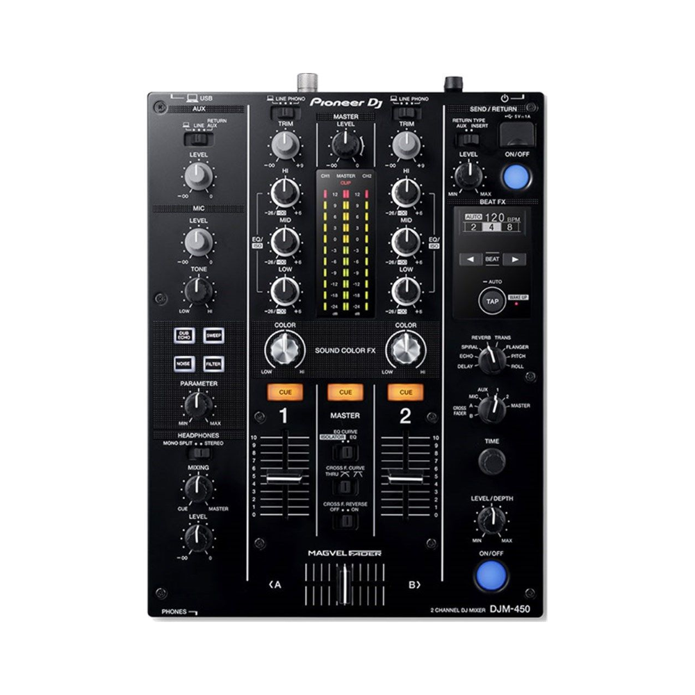 - Easy-to-use DJ 2-channel DJ mixer with onboard effects and sound card